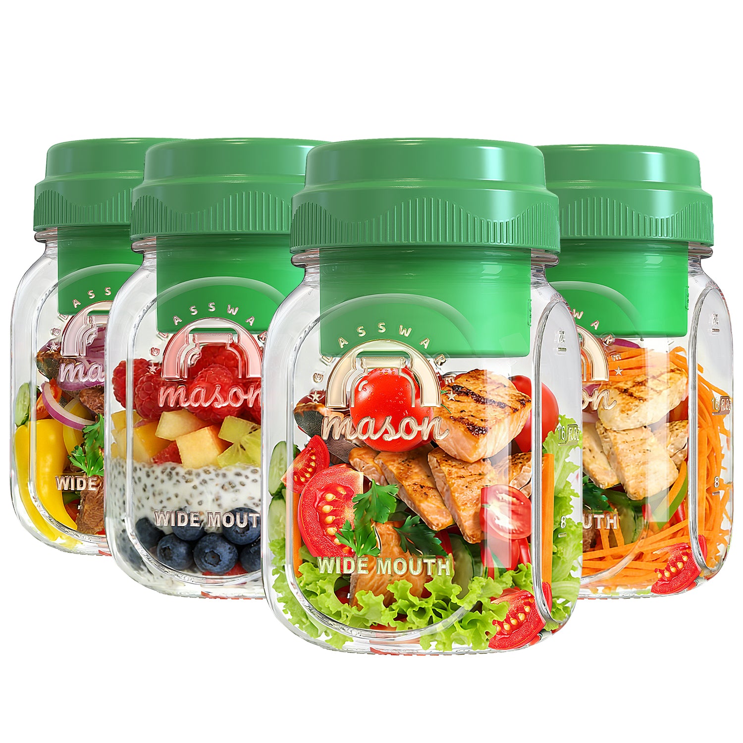 • Large-Capacity Mason Jar 32-Ounce Salad Container: Looking to expand your lunch options? This large salad container holds over 24 ounces of pasta, chicken, salmon, hard-boiled eggs, tomatoes, carrots, cucumbers, red onions, capers, and more! (Note: Graduation lines mark up to 24 ounces, while the salad dressing container's actual capacity is 32 ounces.)