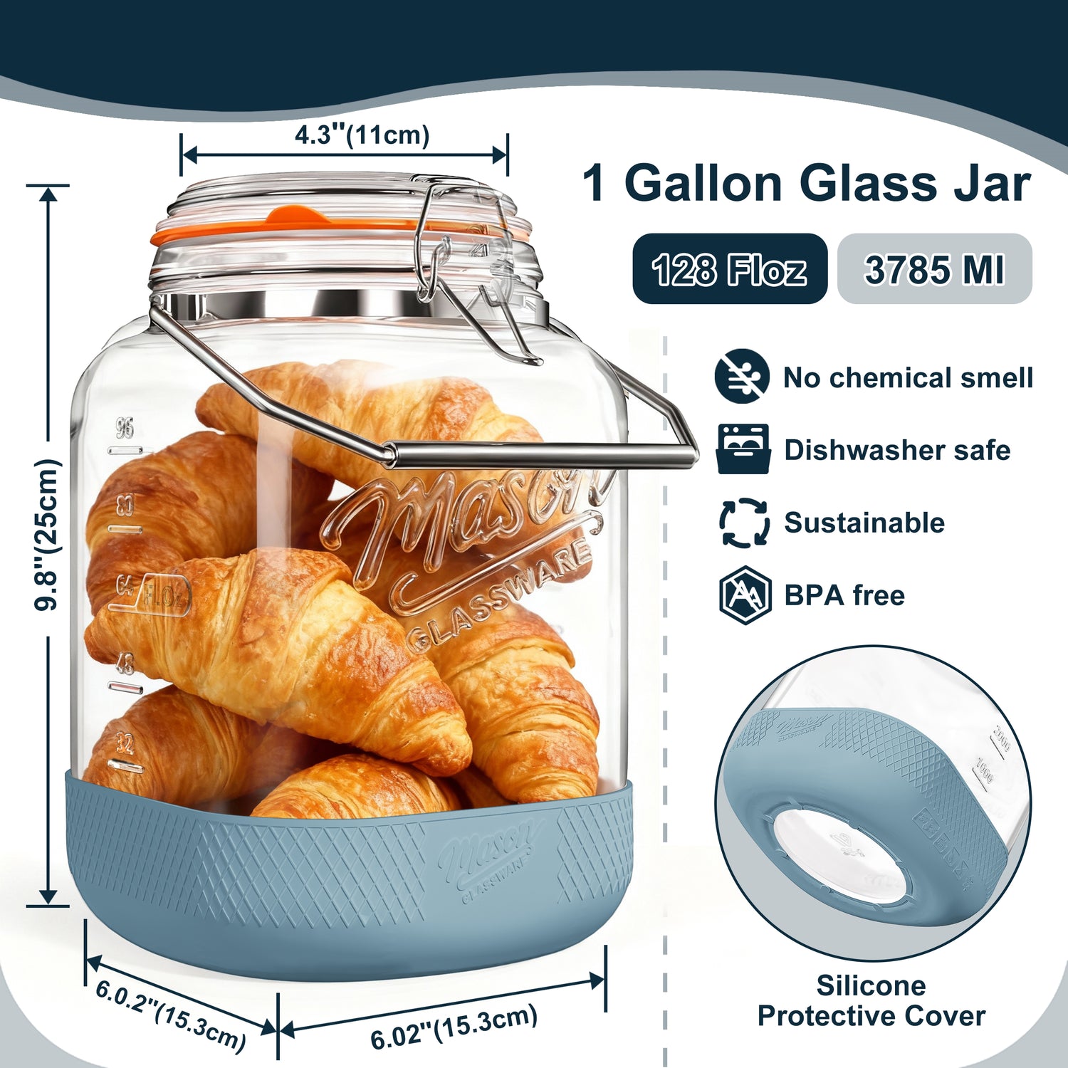 - Heavy-duty Handle with Non-Slip Protective Sleeve: Effortlessly carry heavy, large-capacity glass jars with the conveniently installed stainless steel handle. The upgraded silicone sleeve provides a non-slip, scratch-resistant grip on any countertop, effectively preventing accidents and protecting surfaces. This ensures safe and convenient handling and operation of this giant mason jar.
