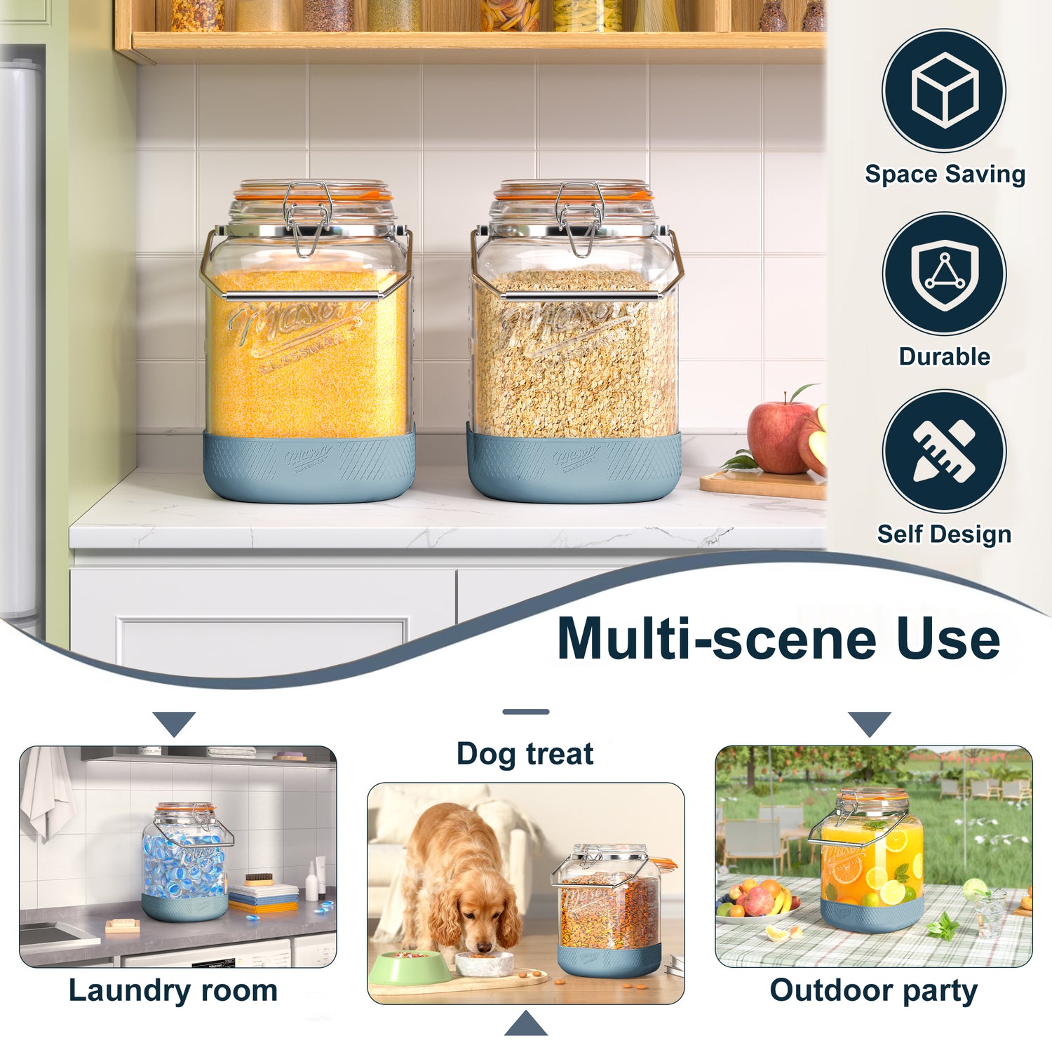 - Value Bundle: You'll receive 2 large-capacity glass jars with airtight lids, 2 stainless steel handles, 2 silicone protective sleeves, and 2 instruction manuals. These 1-gallon Mason jars are perfect for storing dry goods like rice, flour, oatmeal, pasta, coffee beans, cookies, candy, and pet food, keeping your pantry neatly organized.